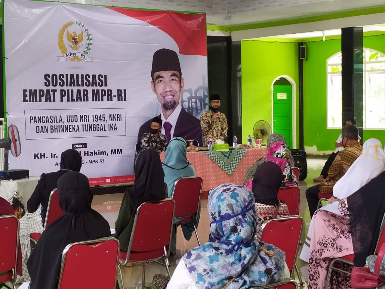 Lampung, dpd.go.id- Anggota DPD/MPR RI Dapil Lampung KH. Ir. Abdul Hakim, MM mengadakan agenda sosialisasi 4 Pilar MPR di Kompleks SDIT Wahdatul Ummah Metro, Jum'at (25/09/2020). Acara ini bekerja sama dengan Yayasan Wahdatul Ummah dengan menghadirkan pengurus yayasan dan masyarakat sekitar. Narasumber lain dalam acara sosialisasi empat pilar MPR ini adalah aktifis Pusat Advokasi dan Hak Asasi Manusia Sapto Nugroho, SH, MH. Dalam sambutannya, pihak Yayasan yang diwakili oleh Heriyanto berterima kasih kepada Abdul Hakim, dan menyampaikan harapannya. “Semoga acara ini dapat menambah pemahaman peserta tentang pentingnya 4 pilar MPR, karena semakin paham kita tentang 4 pilar maka bangsa ini akan semakin kokoh,” kata dia. Senator Lampung Abdul Hakim dalam pemaparannya mengungkapkan inspirasi dari Al-Quran. “Manusia ini diciptakan dari laki-Laki dan perempuan, berbeda-beda suku bangsa dan agama untuk saling mengenal,” kata dia. “Negara merupakan alat untuk mengelola berbagai perbedaan anak bangsa sehingga menjadi kekuatan besar" Abdul Hakim juga menyinggung adanya pihak-pihak yang ingin mengembalikan Pancasila kepada ide-ide lama. “Pancasila sudah final, sudah kesepakatan para pendiri bangsa ini, kita sebagai masyarakat tinggal mengamalkan nilai-nilai yang terkandung didalamnya. Mari bersama kita jaga kebhinekaan dan keutuhan Negara Kesatuan Republik Indonesia” tutup Abdul Hakim Sementara Sapto menambahkan. " Negara kita adalah negara hukum, produk hukum tertinggi kita adalah UUD 45, maka ini menjadi pilar penting bagi sebuah bangsa” ujarnya. Acara dilanjutkan dengan tanya jawab, dan peserta sangat antusias mendengar pemaparan 4 pilar MPR, yakni Pancasila, UUD NRI 1945, NKRI, dan Bhinneka Tunggal Ika. Salah satu peserta menyampaikan harapannya. “Akhir-akhir ini dinegara kita bermunculan organisasi seperti Sunda Empire yang memiliki tatanan pemerintahan sendiri padahal mereka hidup dibawah naungan pemerintah Indonesia, 4 pilar MPR harus mampu mengontrol hal-hal seperti agar tidak terjadi perpecahan ” ungkap Erson.