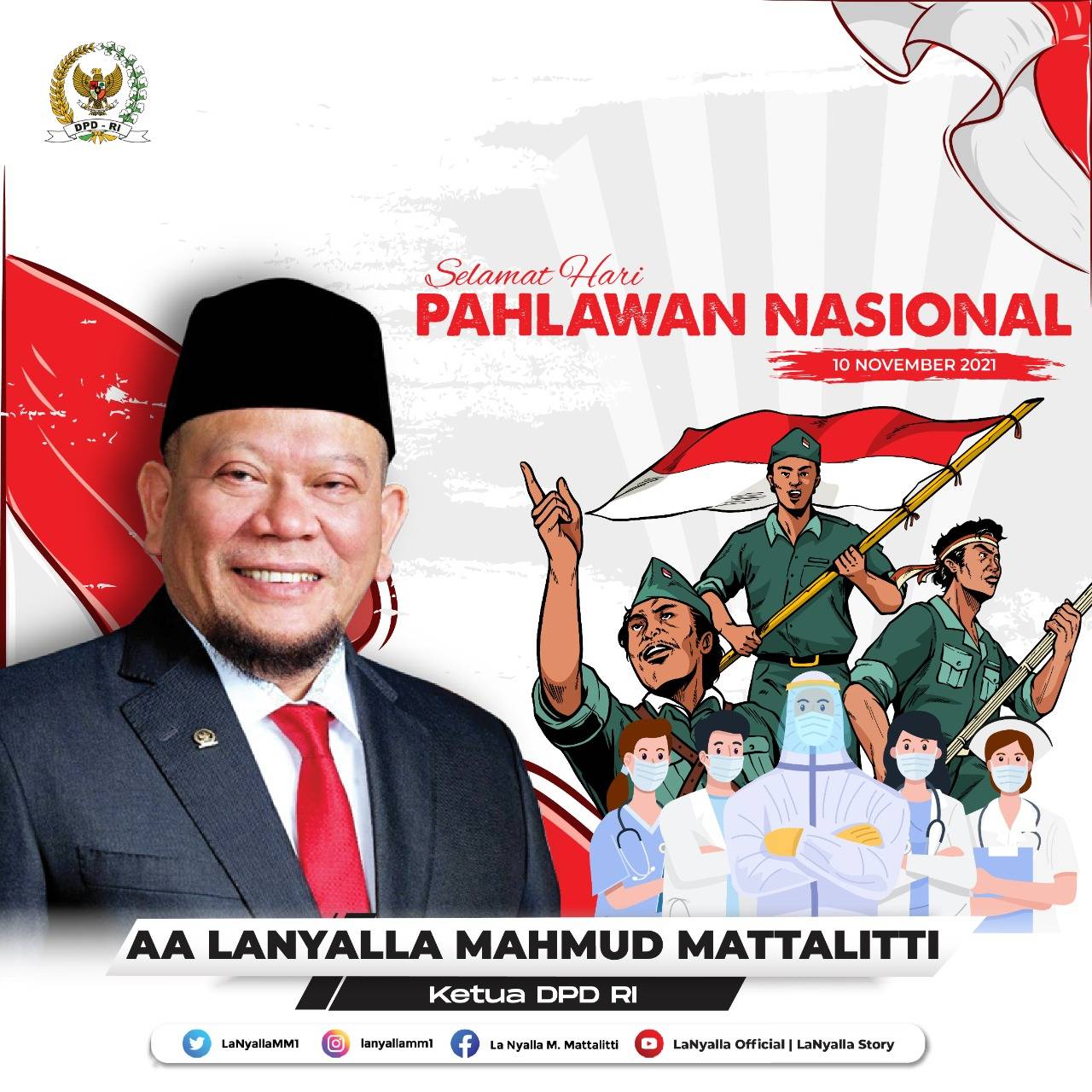"Selamat Hari Pahlawan Nasional" 10 November 2021 Saya mengajak seluruh warga Indonesia, marilah kita wujudkan cita-cita bangsa dengan meneruskan perjuangan para pahlawan. Karena, bangsa yang besar adalah bangsa yang menghormati jasa pahlawannya. Merdeka! AA LANYALLA MAHMUD MATTALITTI KETUA DPD RI #LaNyalla #ketuadpdri #dpdri #daridaerahuntukindonesia #haripahlawannasional #haripahlawan #haripahlawannasional2021 #memperingatiharipahlawan #pahlawankuinspirasiku #10November #haripahlawan10november