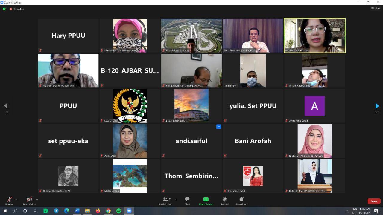Jakarta, dpd.go.id - Panitia Perancang Undang-Undang (PPUU) DPD RI menggelar Rapat Dengar Pendapat Umum secara virtual dalam rangka melakukan pemantauan dan peninjauan terhadap UU No 11 Tahun 2020 tentang Cipta Kerja. Ketua PPUU DPD RI, Badikenita Putri Br Sitepu mengatakan DPD RI memiliki wewenang untuk melakukan pemantauan dan peninjauan terhadap Undang-Undang. “Dalam kerangka itu kami ingin memperoleh gambaran terhadap implementasi Undang-Undang Nomor 11 Tahun 2020 tentang Cipta Kerja sebagai bentuk dari legislative review untuk evaluasi Prolegnas (Program Legislasi Nasional),” katanya dalam rapat virtual PPUU DPD RI dengan pakar hukum nasional, Rabu (18/11). Lebih lanjut Badikenita menyatakan PPUU akan fokus melihat UU Cipta Kerja dalam cluster pelaksanaan administrasi pemerintahan, dan cluster tentang pengadaan tanah. UU Cipta Kerja telah membentuk Bank Tanah. “Kedudukan Bank Tanah itu sendiri dapat dikatakan belum jelas. Bank Tanah dikatakan lembaga khusus, namun lembaga khusus itu termasuk dalam kategori apa juga tidak dapat kita temukan jawabannya dalam UU Cipta Kerja. Karena bank tanah dikatakan BUMN bukan, Badan Layanan Umum (BLU) juga bukan,” ujarnya. Sementara itu, Anggota DPD RI dari Provinsi Kalimantan Tengah Agustin Teras Narang mengatakan permasalahan tanah ini penting untuk meyakinkan investor. “Karena peta yang pusat, bisa beda dengan yang ada di daerah, tapaknya juga berbeda. Belum lagi bagaimana dampaknya untuk masyarakat adat,”paparnya. Senator asal Kalimantan Barat, Maria Goreti mengungkapkan kekhawatirannya mengenai masyarakat adat. “Apakah bisa UU Ciptaker ini ditinjau kembali dengan memasukkan berbagai kearifan lokal dan nasional, sehingga indikator bukan hanya pertumbuhan ekonomi, tetapi juga keanekaragaman hayati dan potensi lokal, sehingga masyarakat adat tidak terpinggirkan di lingkungan yang subur,”ungkapnya. Dalam rapat tersebut, John Pieris, Guru Besar Universitas Kristen Indonesia berpendapat DPD RI dapat meningkatkan fungsi dan peranannya sebagai reviewer (peninjau dan pemantau) juga penilai UU terutama aspek normatif dogmatif dalam legilastive review. “Apakah dilakukan peninjauan dan pemantauan sebelum PP (Peraturan Pemerintah) keluar atau menunggu PP keluar?” cetusnya. John berpendapat kalau dalam melakukan pemantauan dan peninjauan terhadap UU Cipta Kerja, PPUU DPD RI sebaiknya memiliki cukup data mengenai kekurangan prinsipal terhadap norma-norma UU yang dianggap bertentangan dengan UUD 1945, maupun yang tidak sinkron dengan UU yang lain atau dengan UU yang terkait. “Penting juga diusulkan ke Badan Legislatif DPR RI, agar struktur konsideran memperhatikan usul dan saran DPD RI sebagai kamar kedua legislasi,” terangnya. Sementara itu, Budiman Ginting Guru Besar Universitas Sumatera Utara menyarankan dalam peninjauan dapat dimasukkan mengenai nilai-nilai kearifan lokal. “Bagaimana hak ulayat dapat diakomodir tidak tergerus masuknya modal asing. DPD RI juga dapat mengusulkan agar lebih mengutamakan kepentingan daerah.