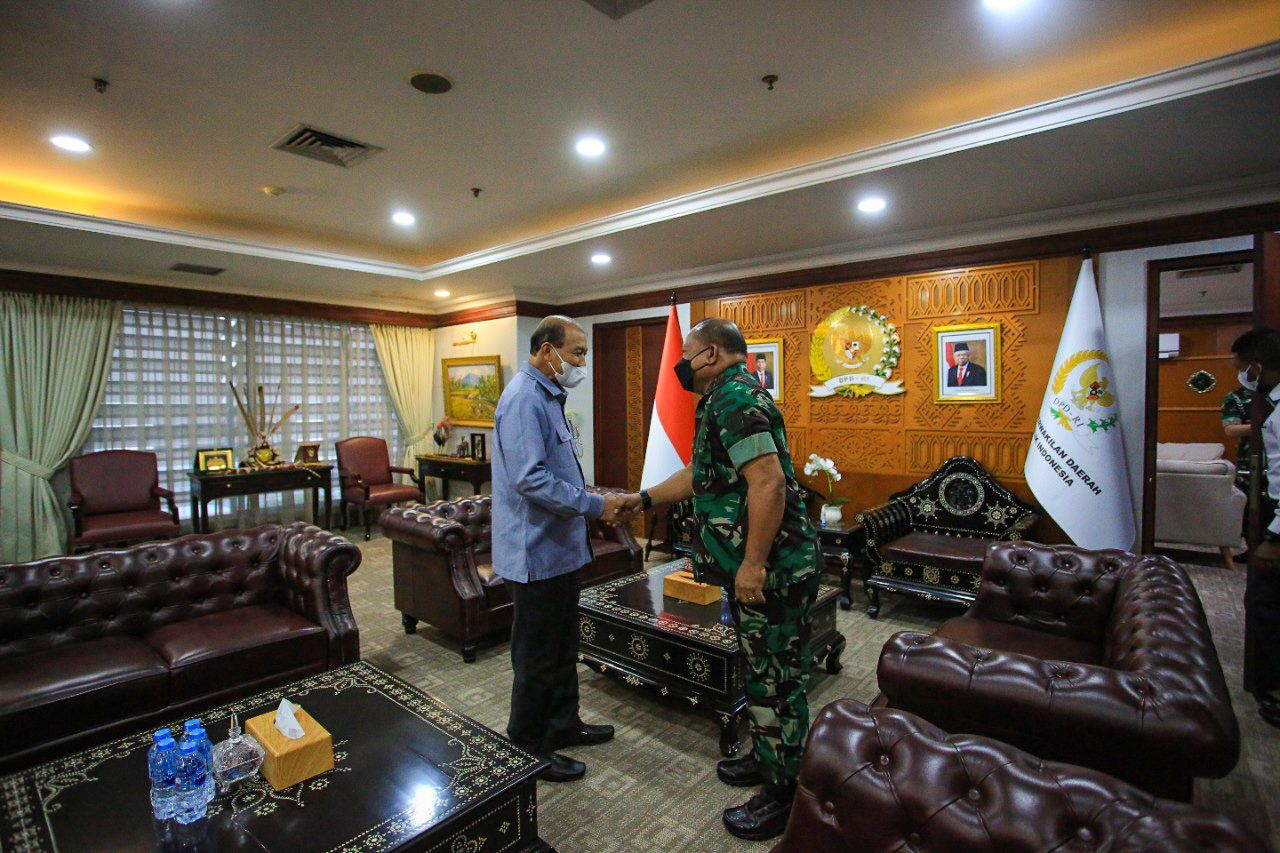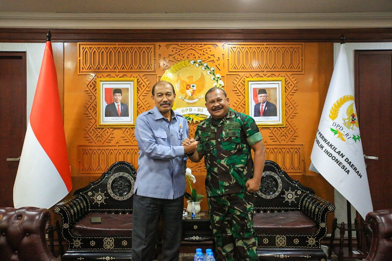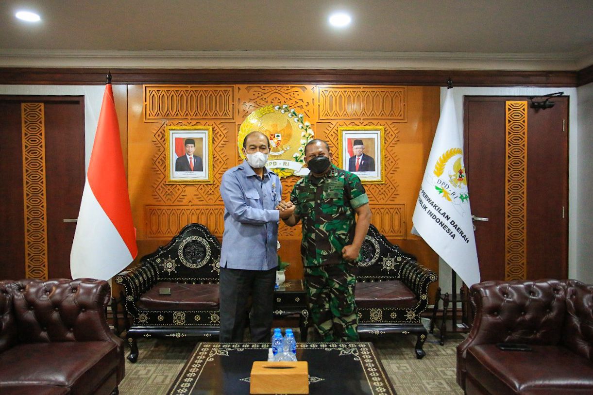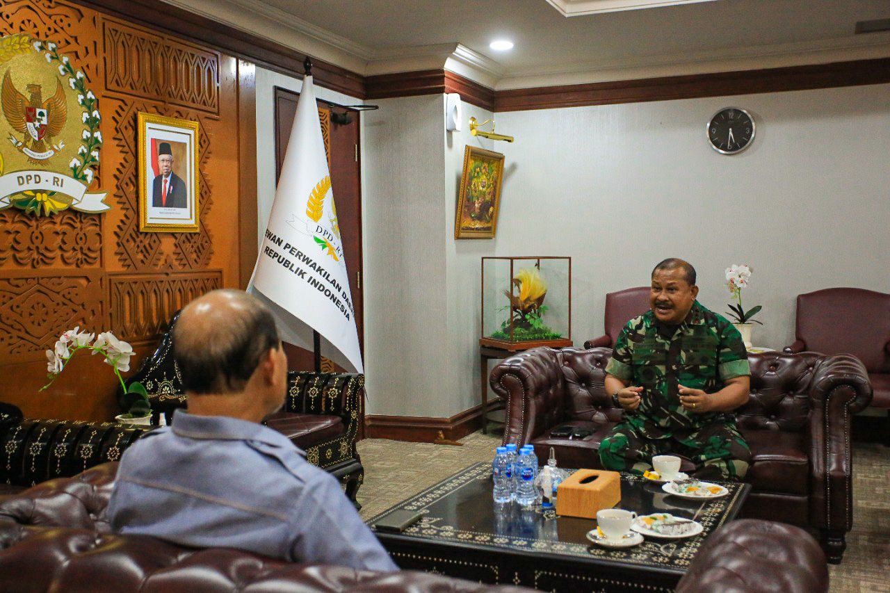 Wakil Ketua I DPD RI Letjen TNI Marinir Purn. Dr. Nono Sampono M.Si. menerima kunjungan Panglima Komando Gabungan Wilayah Pertahanan III (Pangkogabwilhan III) Letjen TNI Jeffry Apoly Rahawarin di Ruang Kerja Nusantara III lt. 8, dalam rangka berdiskusi mengenai dampak dan cara menyikapi situasi perkembangan lingkungan geostrategi dan geopolitik di kawasan Asia Pasifik, terutama di Kawasan Timur Indonesia.