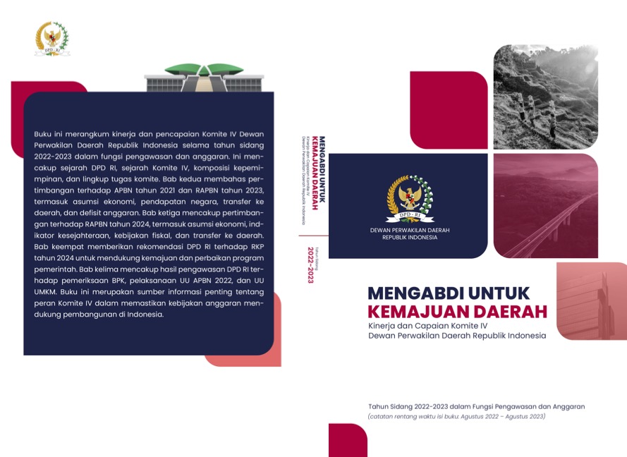 Buku ini merangkum kinerja dan pencapaian Komite IV DPD RI selama tahun sidang 2022-2023 dalam fungsi pengawasan dan anggaran. Ini mencakup sejarah DPD RI, sejarah Komite IV, komposisi kepemimpinan, dan lingkup tugas komite. BAB II membahas pertimbangan terhadap APBN tahun 2021 dan RAPBN 2023, termasuk asumsi ekonomi, pendapatan negara, transfer ke daerah, dan defisit anggaran. BAB III mencakup pertimbangan terhadap RAPBN 2024, termasuk asumsi ekonomi, indikator kesejahteraan, kebijakan fiskal, dan transfer ke daerah. BAB IV memberikan rekomendasi DPD RI terhadap RKP Tahun 2024 untuk mendukung kemajuan dan perbaikan program pemerintah. BAB V mencakup hasil pengawasan DPD RI terhadap pemeriksaan BPK, pelaksanaan UU APBN 2022, dan UU UMKM. Buku ini merupakan sumber informasi penting tentang peran Komite IV dalam memastikan kebijakan anggaran mendukung pembangunan di Indonesia.