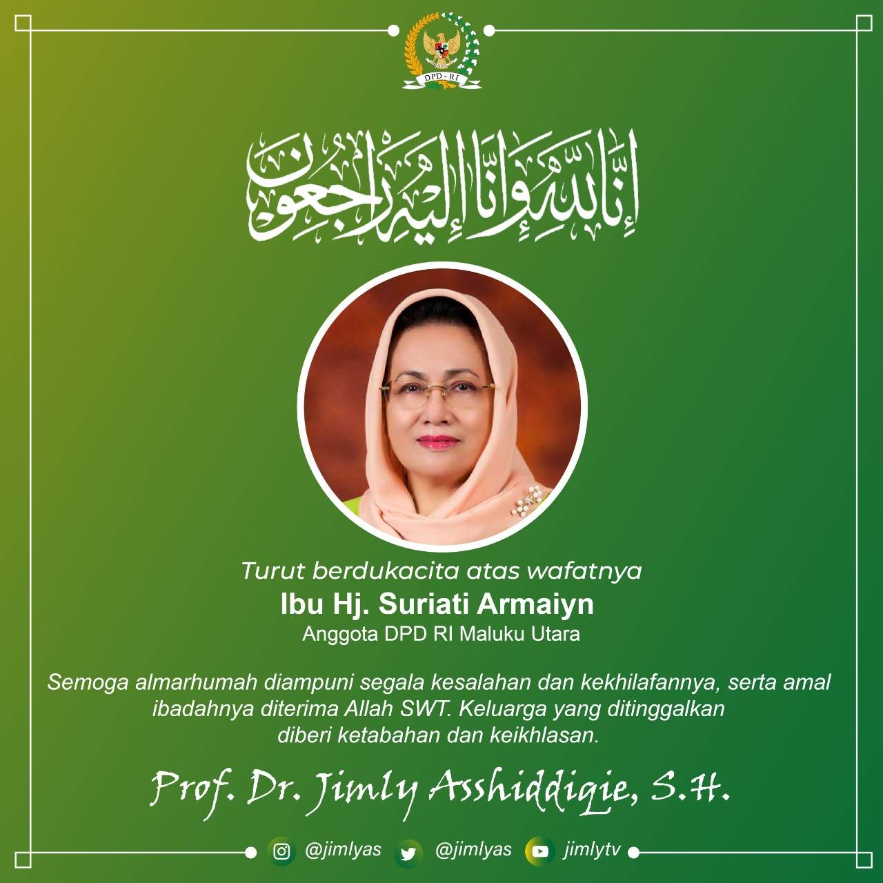 "Inna lillahi wainna ilaihi roji'un"  Saya dan keluarga serta sebagai Ketua DPD RI turut berduka cita sedalam-dalamnya atas berpulangnya ke...