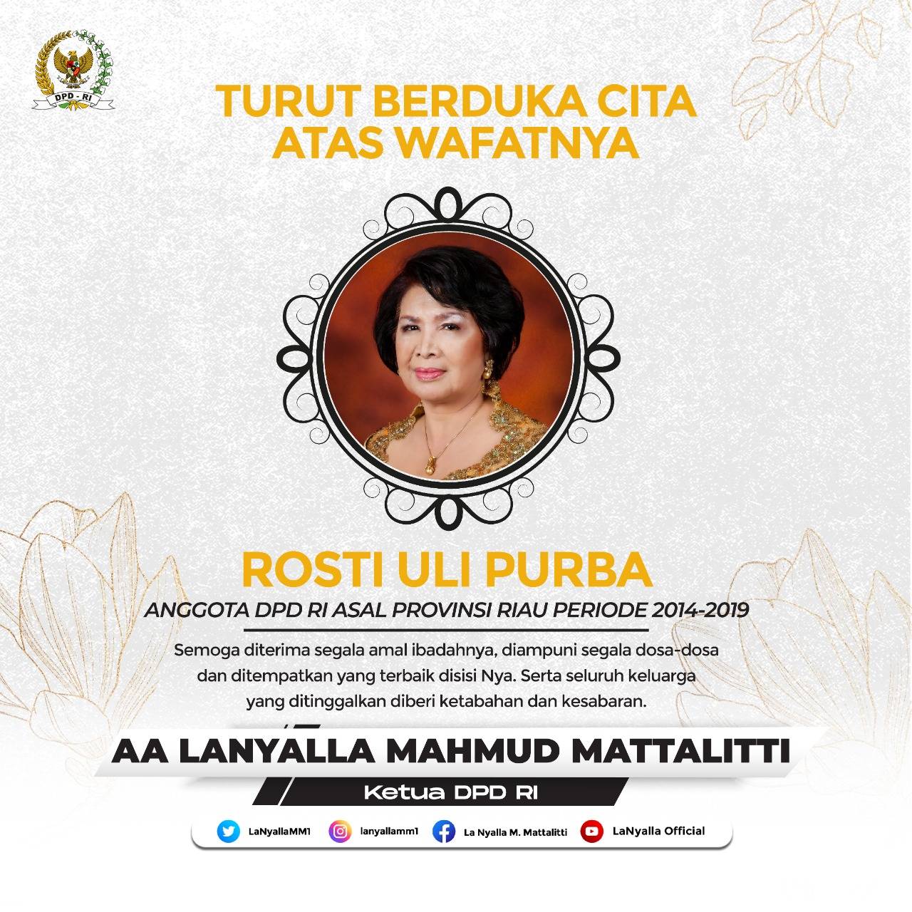 "Turut Berduka Cita" Ketua DPD RI menyampaikan turut berbelasungkawa sedalam-dalamnya atas berpulangnya Rosti Uli Purba. (Anggota DPD MPR RI Dapil...