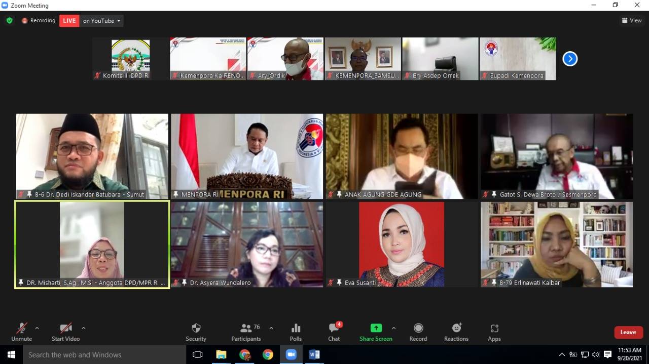 Jakarta, dpd.go.id – Komite III DPD RI menggelar Rapat Kerja dengan Kementerian Pemuda dan Olahraga RI secara virtual, Senin (20/2021)....