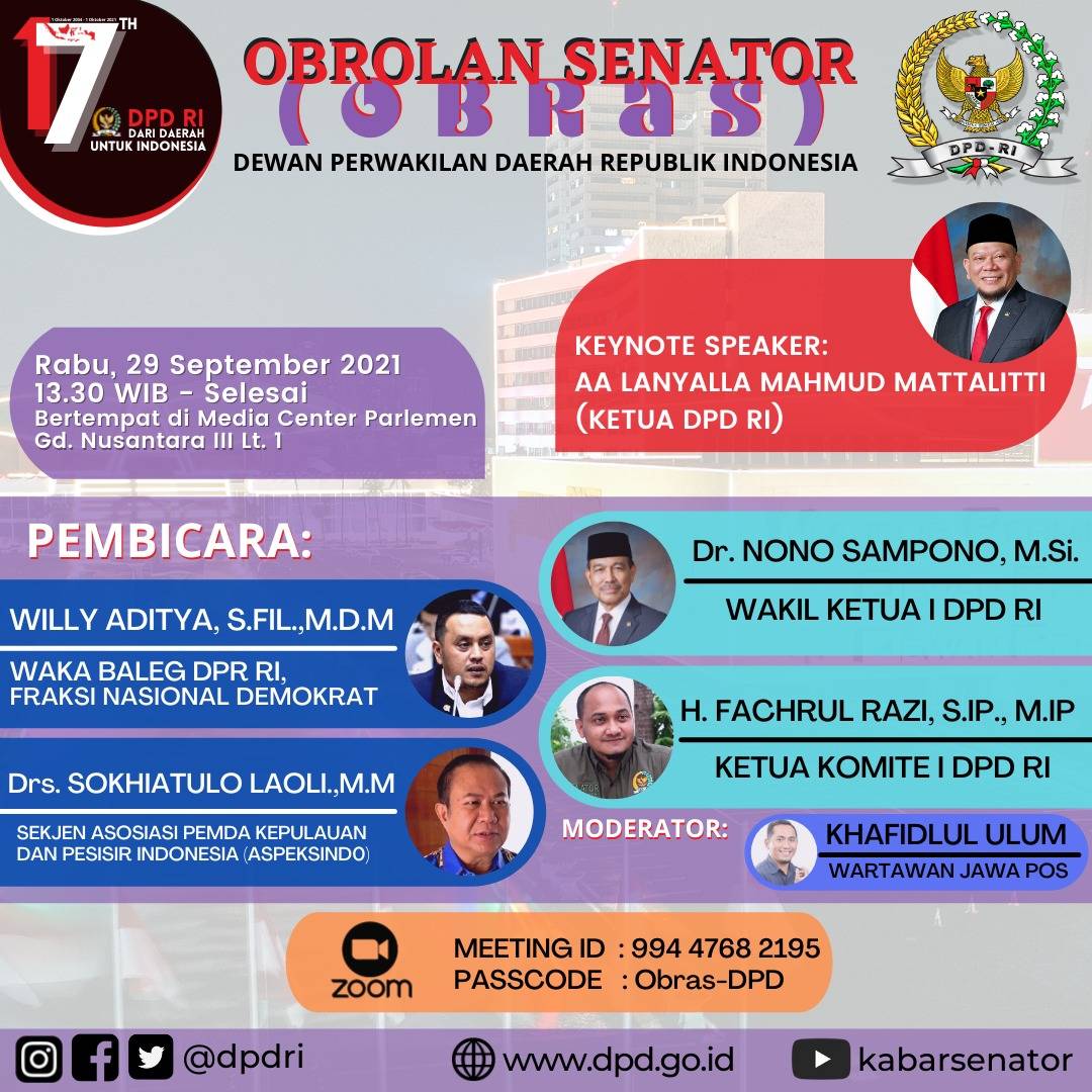*Obrolan Senator (Obras)* “PEMBANGUNAN DAERAH KEPULAUAN DALAM MENGOPTIMALKAN POTENSI NEGARA MARITIM” _Keynote Speaker_: La Nyalla Mahmud Mattalitti (Ketua DPD RI)...
