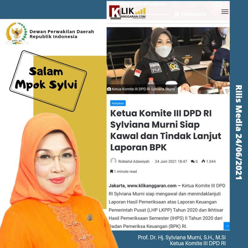 Jakarta, dpd.go.id - Ketua Komite III DPD RI Sylviana Murni siap mengawal dan menindaklanjuti Laporan Hasil Pemeriksaan atas Laporan Keuangan...