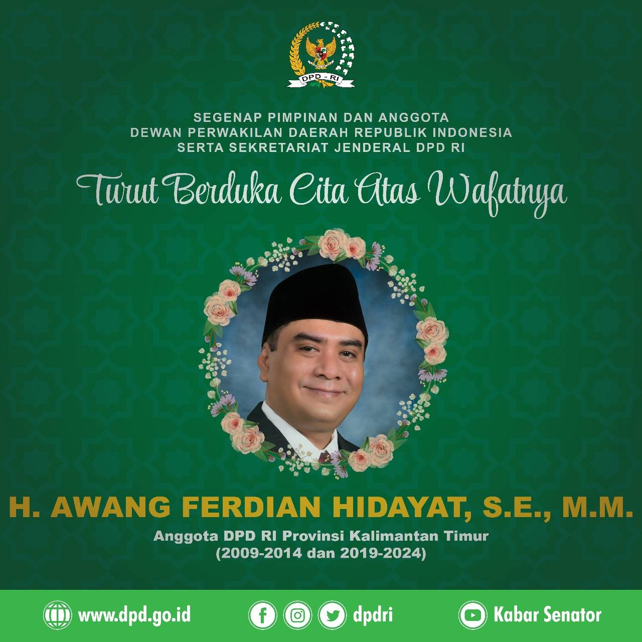 Segenap Pimpinan dan Anggota DPD RI serta Sekretariat Jenderal DPD RI Turut Berduka Cita Atas Wafatnya Bapak Awang Ferdian Hidayat,...