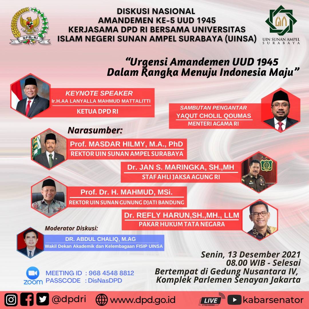 Diskusi Nasional dengan tema Urgensi Amandemen UUD 1945 dalam Rangka Menuju Indonesia Maju digelas Senin, 13 Desember 2021 Pukul 08.00...