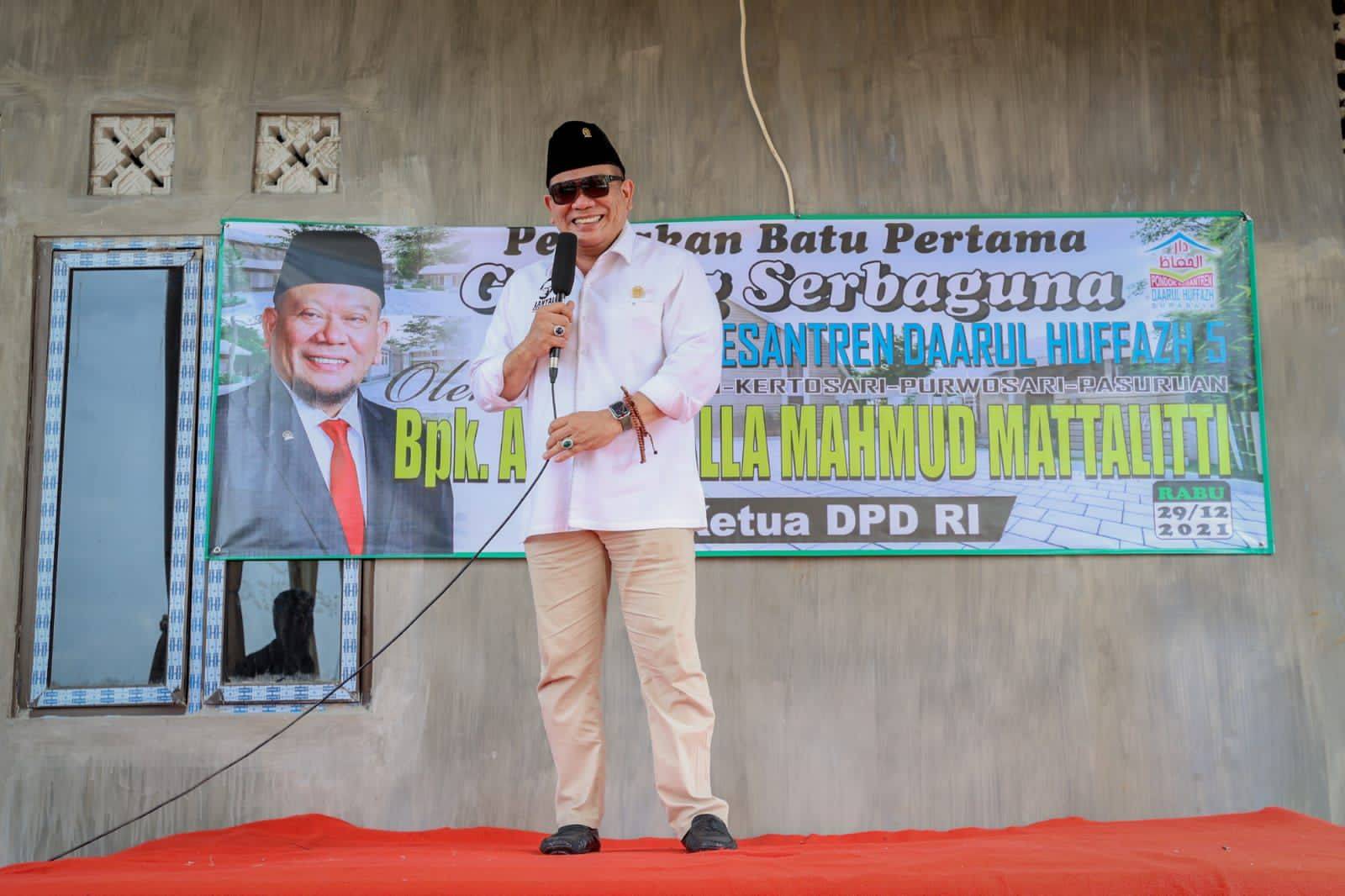 Pasuruan, dpd.go.id - Ketua DPD RI, AA LaNyalla Mahmud Mattalitti, melakukan peletakan batu pertama pembangunan Gedung Serbaguna Pondok Pesantren Daarul...