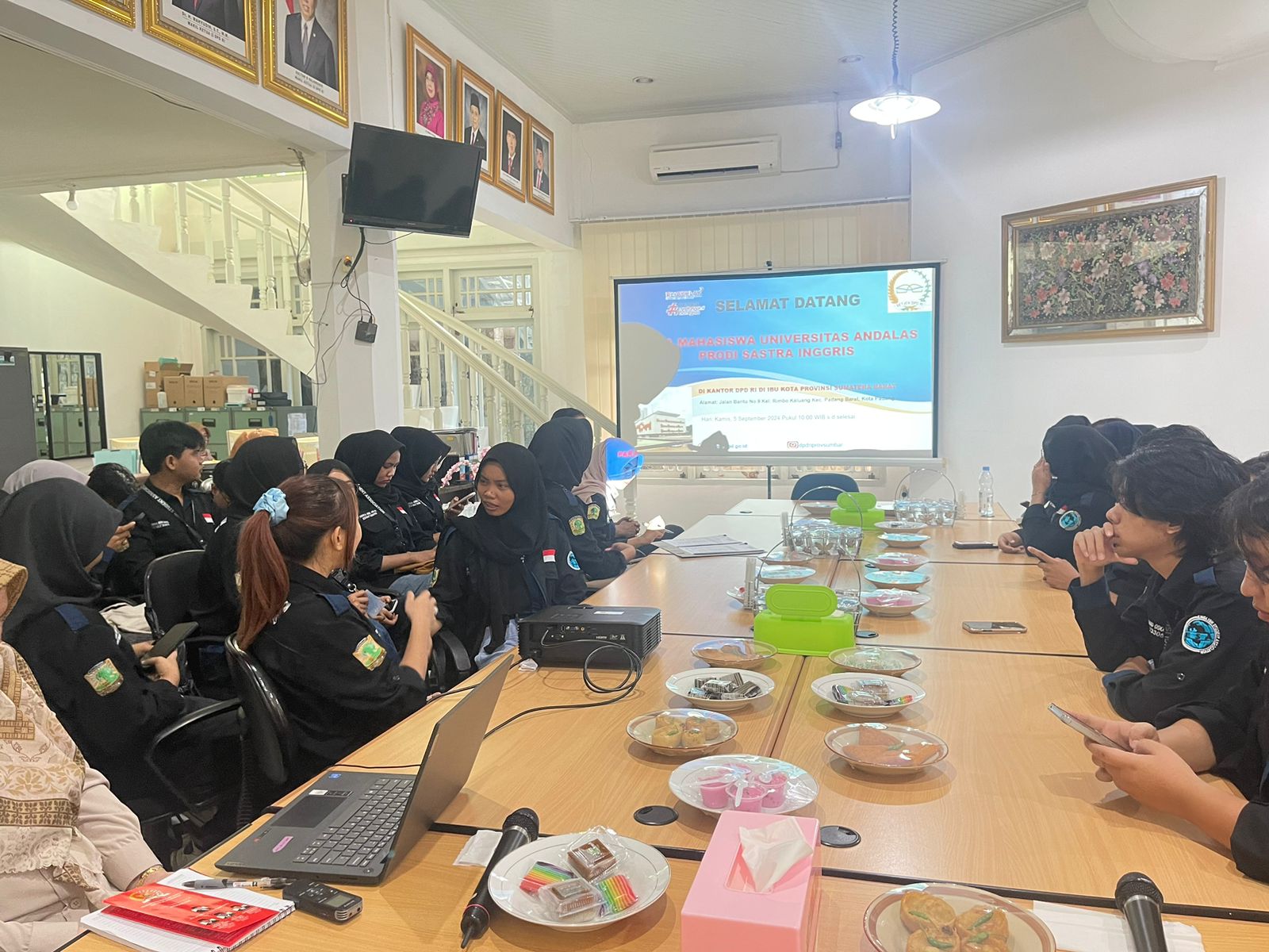 Kantor DPD RI Provinsi Sumatera Barat menerima kunjungan dari English Student Association (ESA) Program Studi Sastra Inggris Fakultas Ilmu Budaya Universitas Andalas di ruang rapat Kantor DPD RI Provinsi Sumatera Barat, dalam rangka audiensi dengan Kantor DPD RI di Ibu Kota Provinsi Sumatera Barat yang dihadiri sebanyak 30 orang perwakilan mahasiswa Universitas Andalas. Kunjungan ini disambut oleh Kepala Kantor DPD RI di Ibu Kota Provinsi Sumatera Barat Erdia Nova, S.Sos.,MM yang didampingi oleh Kepala Subbagian Perenacanaan dan Keuangan Andri Matovani, beserta staf.