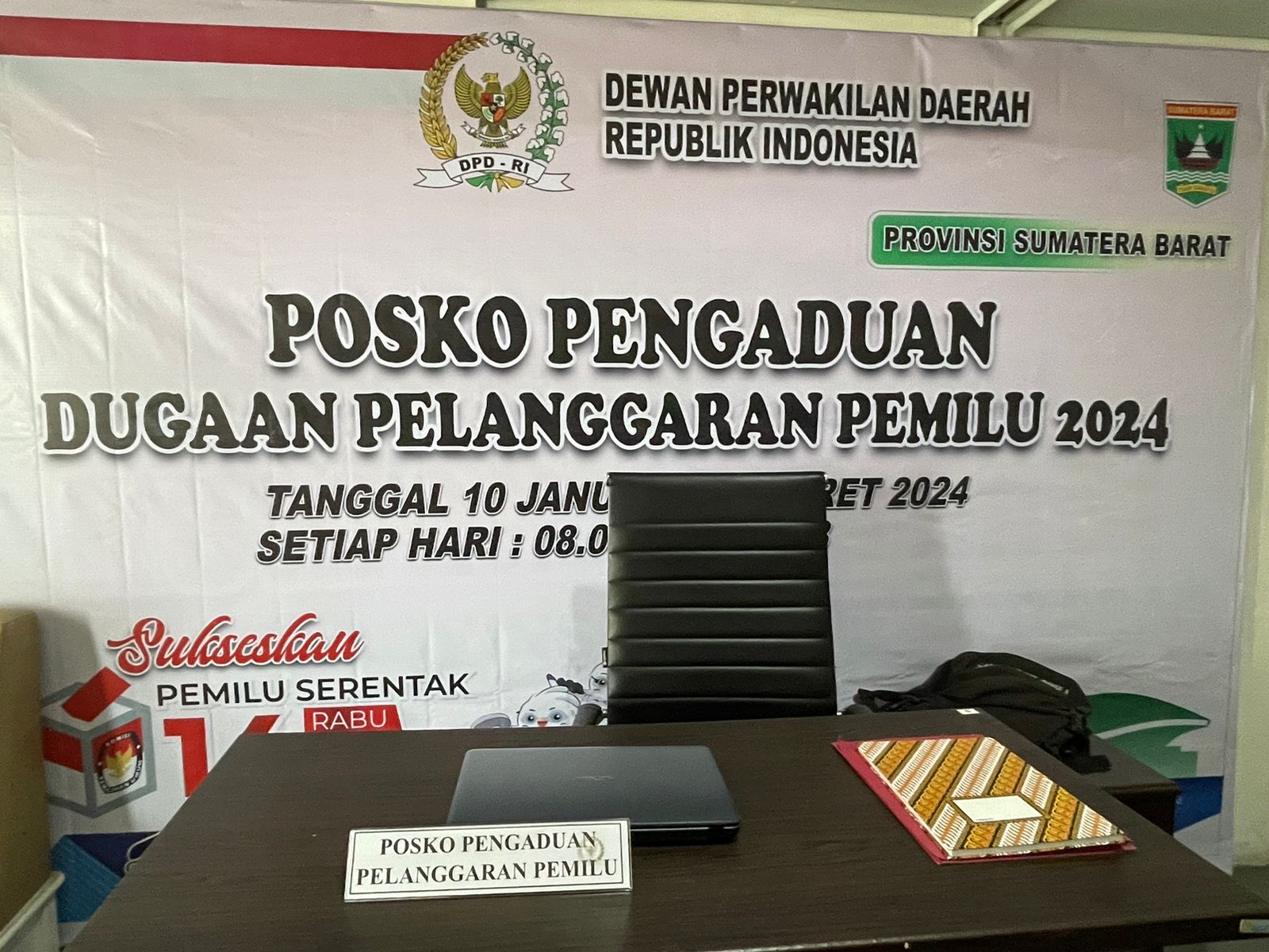 Kantor DPD RI Provinsi Sumatera Barat membuka Posko Pengaduan Dugaan Pelanggaran Pemilu 2024 yang terbuka untuk umum yang akan mulai bekerja efektif dari tanggal 10 Januari hingga 20 Maret 2024 pukul 08.00 s/d 16.00 WIB.