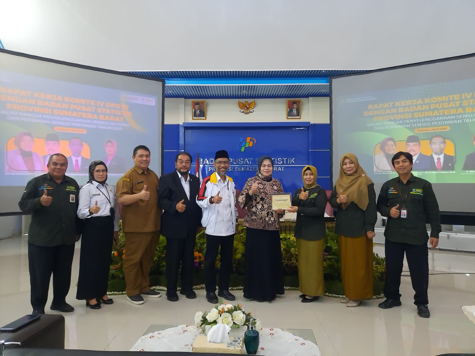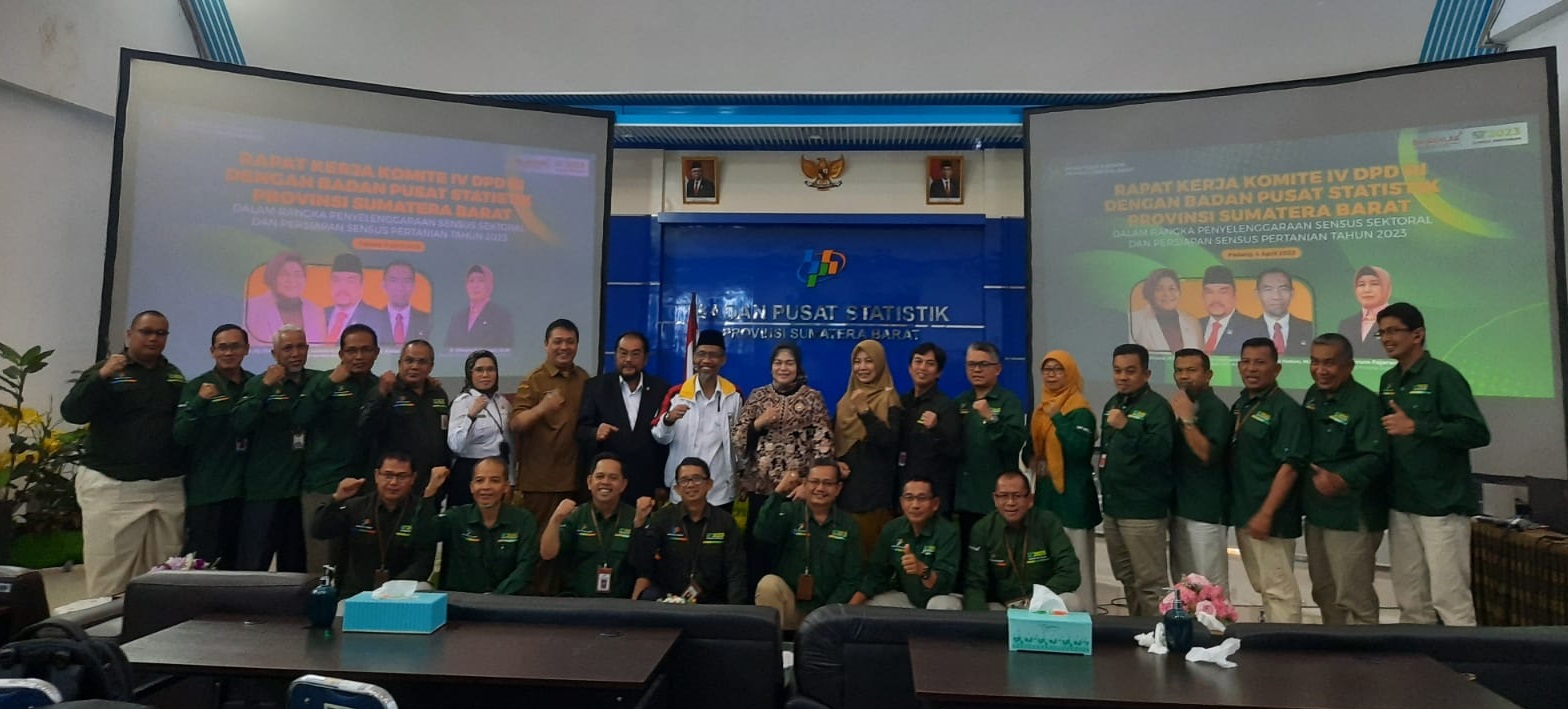 Rapat Kerja Komite IV DPD RI dengan Badan Pusat Statistik Provinsi Sumatera Barat, dalam rangka penyelenggaraan sensus sektoral dan persiapan sensus pertanian tahun 2023 di Provinsi Sumatera Barat. Rapat Kerja ini dihadiri oleh Ibu Dra. Hj. Elviana M.Si, Bapak Hj. Leonardy Harmainy Dt. Bandaro Basa, S.IP., MH, Bapak KH. Ir. Abdul Hakim, MM dan disambut langsung oleh Ibu Ir. Herum Fajarwati, MM Kepala BPS Provinsi Sumatera Barat beserta jajarannya.