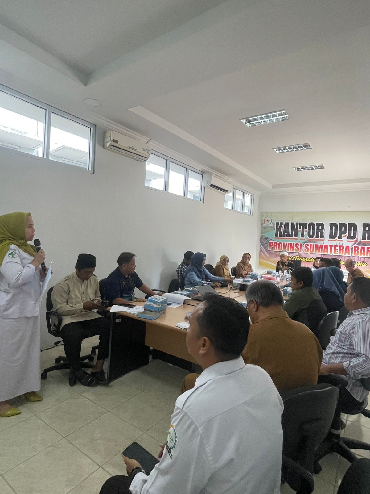 Anggota DPD RI H. Jelita Donal., Lc melakukan Rapat Kerja Bersama Kepala Dinas Kesehatan, Sekretaris Pendidikan, Direktur Rs. Unand Padang, Direktur Politeknik Padang, Kepala BPOM, Dinas Perindustrian dan Perdagangan dan Kepala Puskesmas di Kantor DPD RI Provinsi Sumatera Barat. Hal ini terkait dengan Inventarisasi materi pengawasan pelaksanaan UUD No 17 Tahun 2023 tentang Kesehatan, Khususnya Pengendalian Konsumsi Minuman Berpemanis dalam Kemasan (MBDK), Transformasi Pendidikan Kesehatan, dan Pengendalian Penyakit TBC dan Penyakit Menular Lainnya.